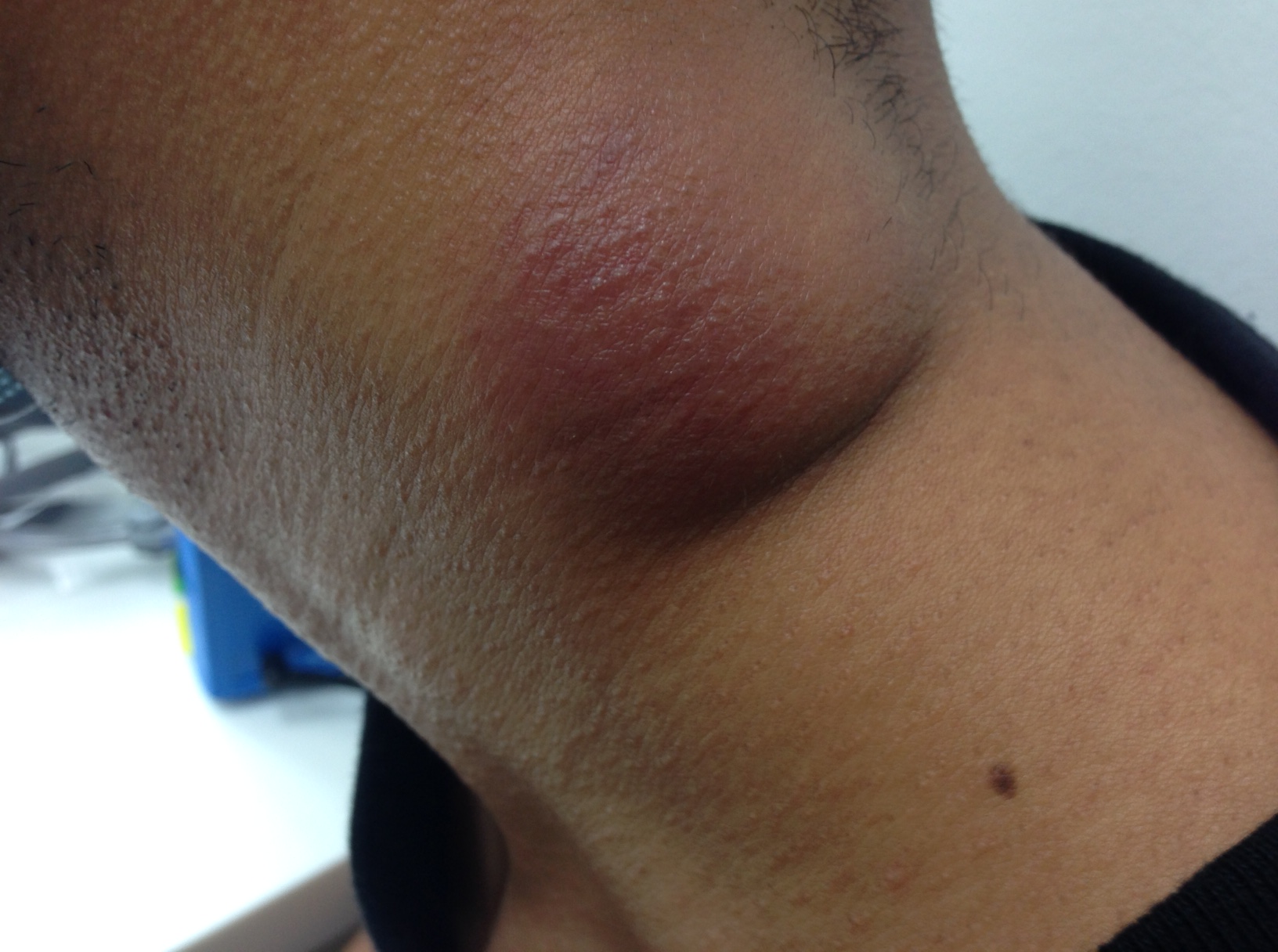 A previously healthy young man from Myanmar who works in the IT industry in Singapore. Presented with a left neck lump that increased gradually in size over the past 10 weeks, associated with a low-grade fever (up to 37.9 degrees Celsius) over the past month. No other systemic symptoms or such as cough or weight loss. One week prior to his medical appointment, a little pustule developed over the lump which discharged seropurulent (yellowish) fluid spontaneously.