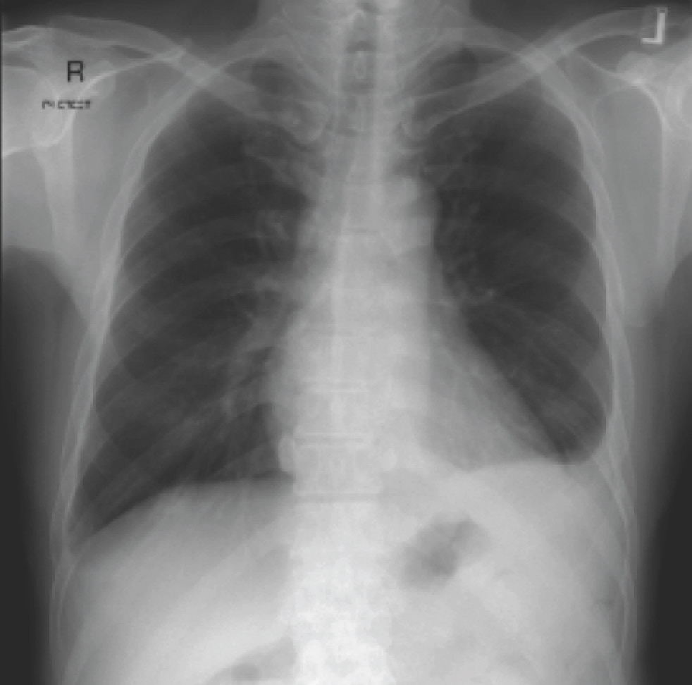 A middle-aged (60-year-old) man with Type 2 diabetes mellitus and past history of tuberculosis presented with low-grade fever for 2 weeks and a 1.5 cm nodule over his left lower back (approximately L1 level). This was determined to be an abscess and creamy white pus was aspirated by his general practitioner. The Gram stain showed Gram-negative bacilli, and his chest X-ray (and a segment of the subsequent CT abdomen) is shown below.