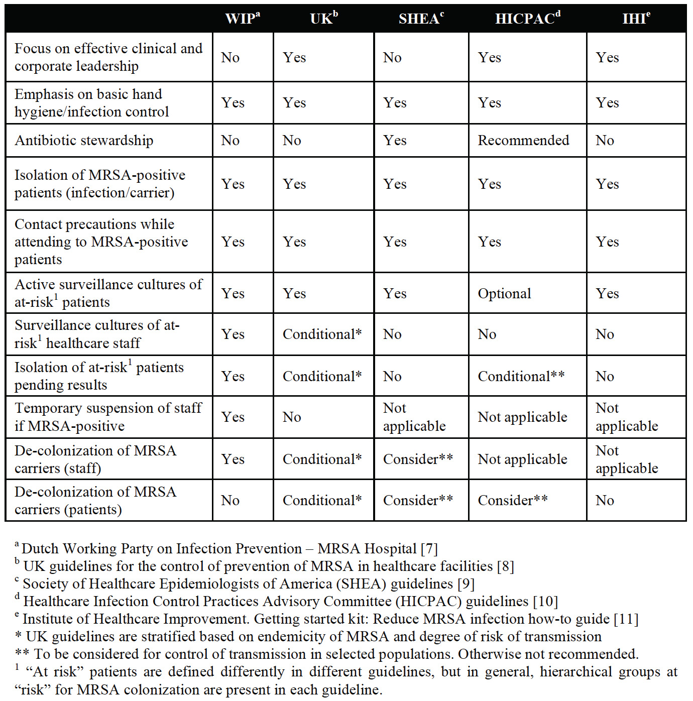 All regions/countries with low MRSA rates in their hospitals have guidelines similar to WIP (Dutch Working Party on Infection Prevention – column 1 of the Table). The “extra mile” in terms of infection control practices involve: