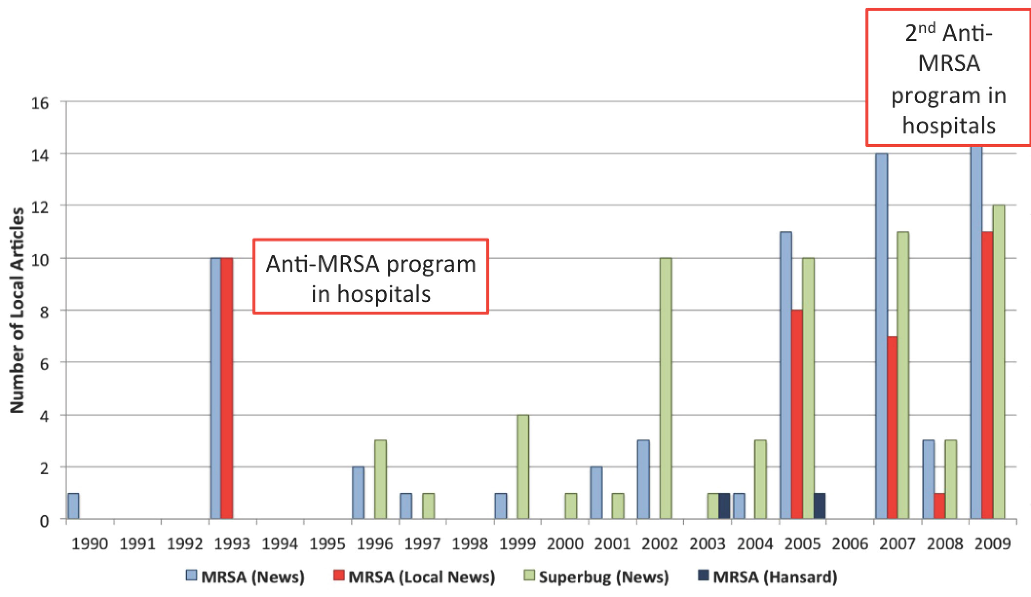 After a period of 6-7 years of “rational MRSA control’ targeted towards MRSA containment rather than eradication, many Singaporean public sector hospitals stepped up efforts to reduce their MRSA burden again. While it was clear that the infection control staff from different hospitals were communicating with each other, there was no overall or coordinated strategy among them. Why were such efforts started again at this time (2006-2007)? I don’t have the answer, but the following chart from a previous post – now annotated – shows an intriguing association. Each of the two MRSA “campaigns” appeared to have started after reports of MRSA in local hospitals have appeared in the local news.