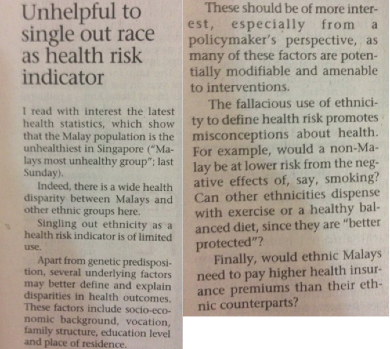 I conclude with an image of a letter in the Sunday Times yesterday that brought up thoughts of ethnicity and infectious diseases in Singapore. The letter writer made several very relevant points with regards to perspectives of health locally.