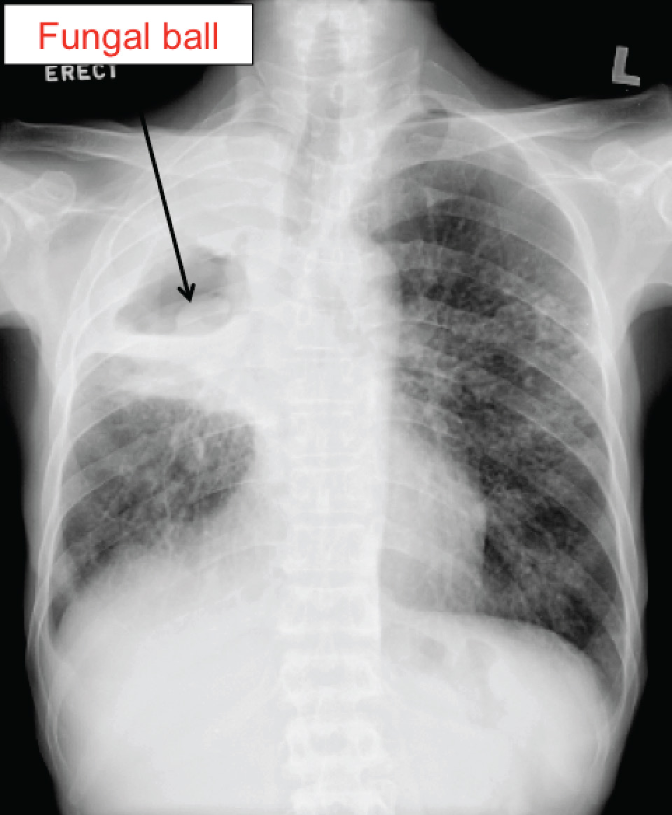 Chest X-ray with patient in the right lateral recumbent position. The fungal ball has “fallen” by gravity.