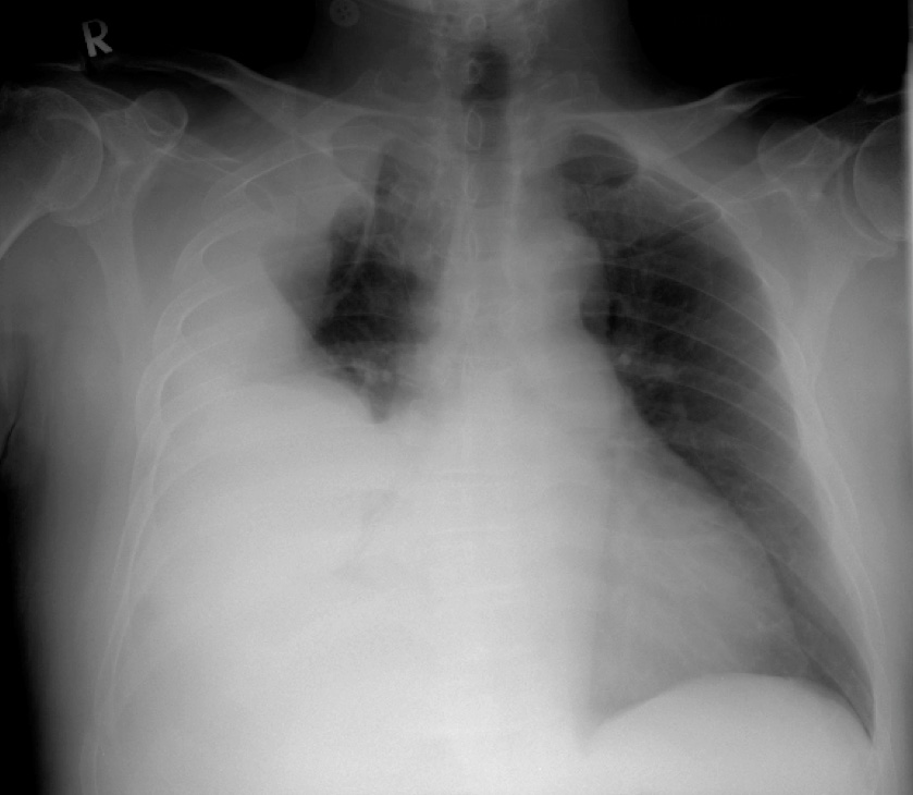 The chest X-ray and subsequent representative CT thorax images are given below, showing a massive right-sided pleural effusion that is also multi-loculated..
