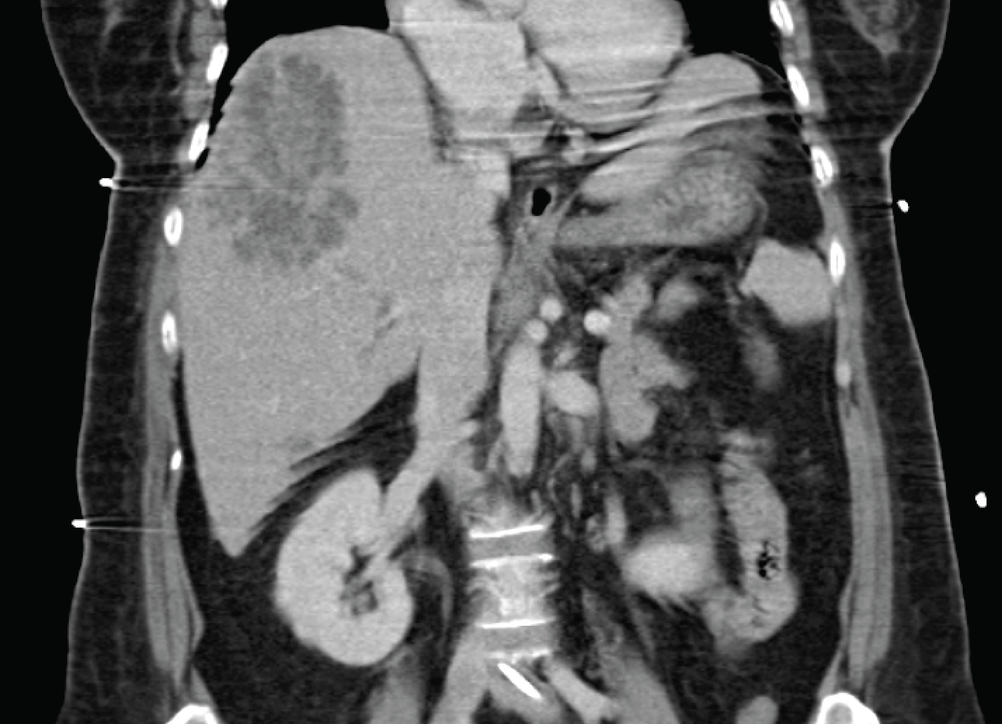A middle-aged man in his late 50’s presented with fever for 3 days associated with poor appetite and epigastric discomfort. He had been prescribed augmentin by his general practitioner 2 days ago without relief of symptoms. His only premorbid conditions were hypertension and hyperlipidemia, and there was no travel or contact history of significance. Physical examination revealed right hypochondral tenderness, and a CT abdomen was ordered.