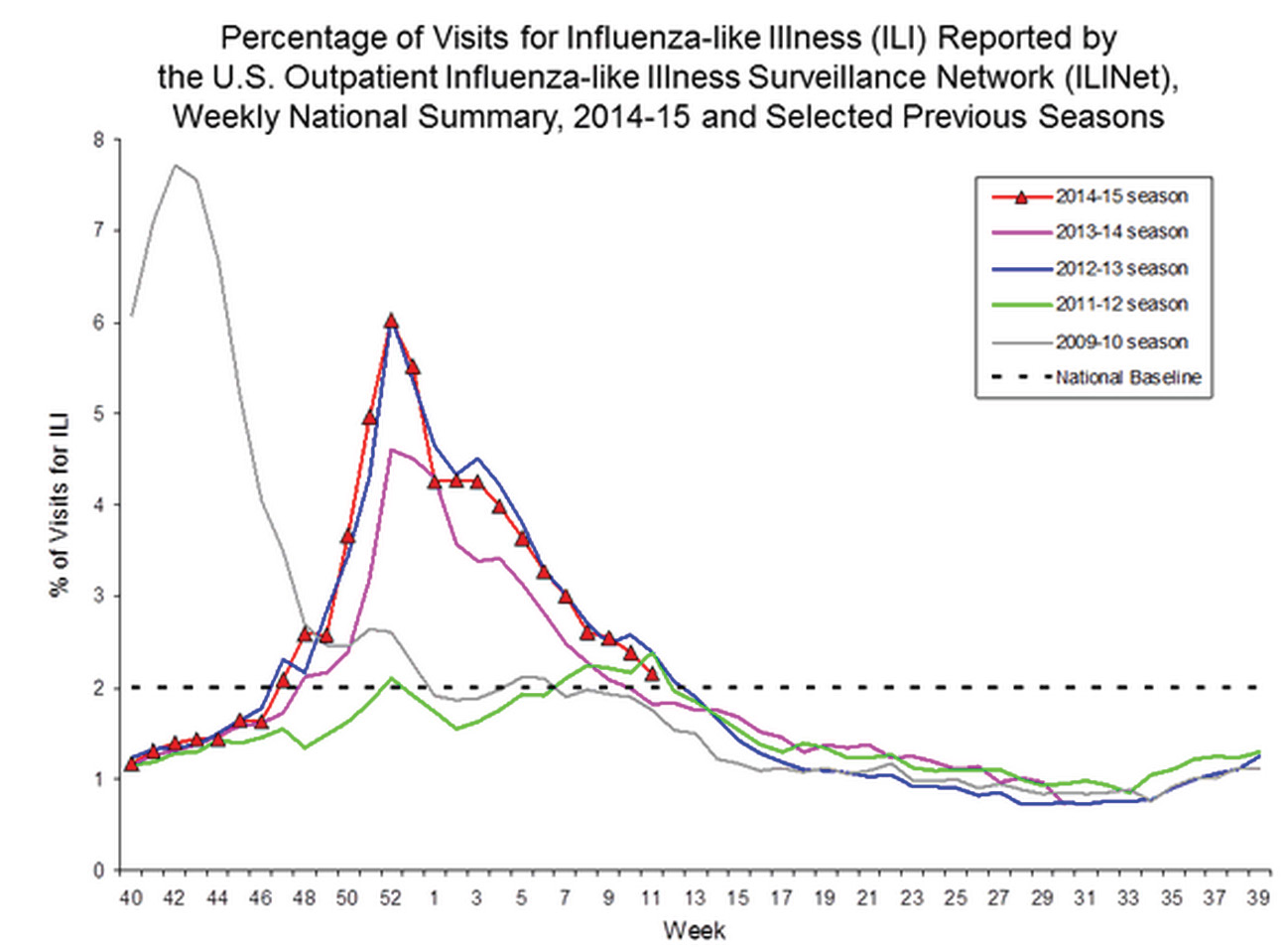 Percentage of influenza-like illness cases reported by the U.S. Outpatient Illness Surveillance program.