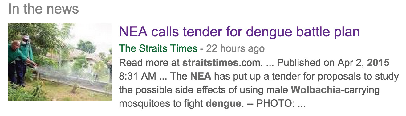 I was directed by the SGH microbiology blog‘s chief blogger to the Straits Times report yesterday detailing the National Environment Agency (NEA)’s tender for studying the effects of using Wolbachia-carrying male mosquitoes to combat dengue in Singapore.