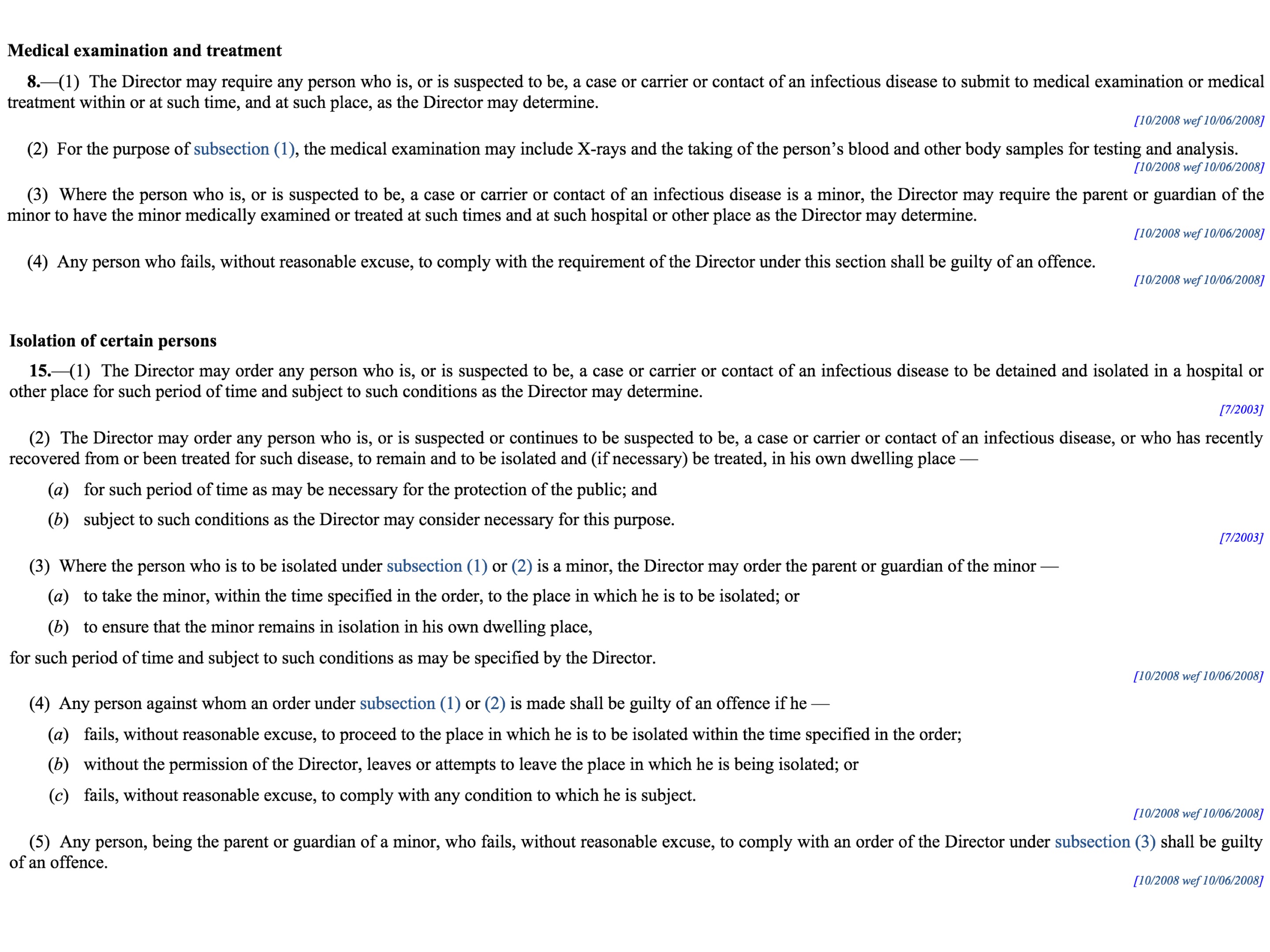 In Singapore, the Tuberculosis Control Unit (TBCU) actively engages patients who are non-compliant to anti-tuberculosis therapy, employing a variety of measures to determine and address the reasons for non-compliance. Such measures include but are not limited to counselling, medical social worker review for assistance with financial and social problems, and the provision of supermarket vouchers sponsored by SATAComm Health – a local non-governmental organization – for those who subsequently adhere to directly observed therapy (DOT). Nonetheless, there remain patients that continue to be non-compliant despite these efforts. These recalcitrant patients are evaluated by the Committee for TB Treatment Defaulters, established since 2004 with members appointed by the Ministry of Health (MOH), that makes recommendations to the Director of Medical Services (DMS – the top “ranking” doctor in MOH Singapore) whether the aforementioned patients should undergo compulsory DOT until completion of therapy. The MOH will then serve legal orders to the patients under the Infectious Disease (ID) Act, where patients are ordered to comply or else face fines (up to SGD10,000) and/or imprisonment (up to one year). There are two relevant levels of the ID Act : Section 8(1) and Section 15(1). Section 8(1) states that the DMS may require any person with an infectious disease to submit to medical examination or treatment, whereas Section 15(1) states that the DMS may order any person with an infectious disease to be detained and isolated in a hospital or other place for a period of time and under conditions to be determined by the DMS.