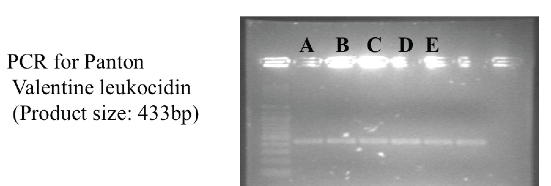 Gel electrophoresis showing positive PCR products for Panton-Valentine Leukocidin for the 5 initial CA-MRSA isolates in Singapore.