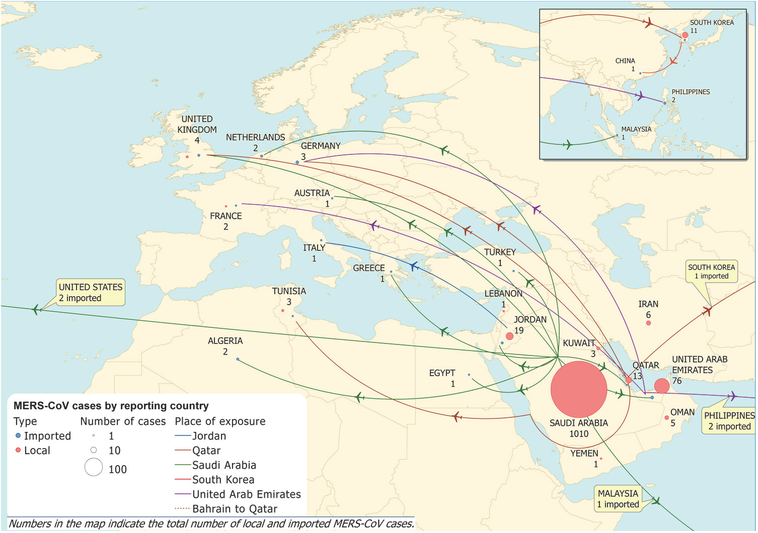 There are 1,172 cases as of 30th May 2015 (1,134 in the Middle-Eastern countries) with 479 deaths (case fatality rate of 40.9%). The latest ECDC epidemiology report has a beautiful map geographic distribution of confirmed MERS-CoV cases and likely source of origin, which I have taken the liberty to reproduce below.