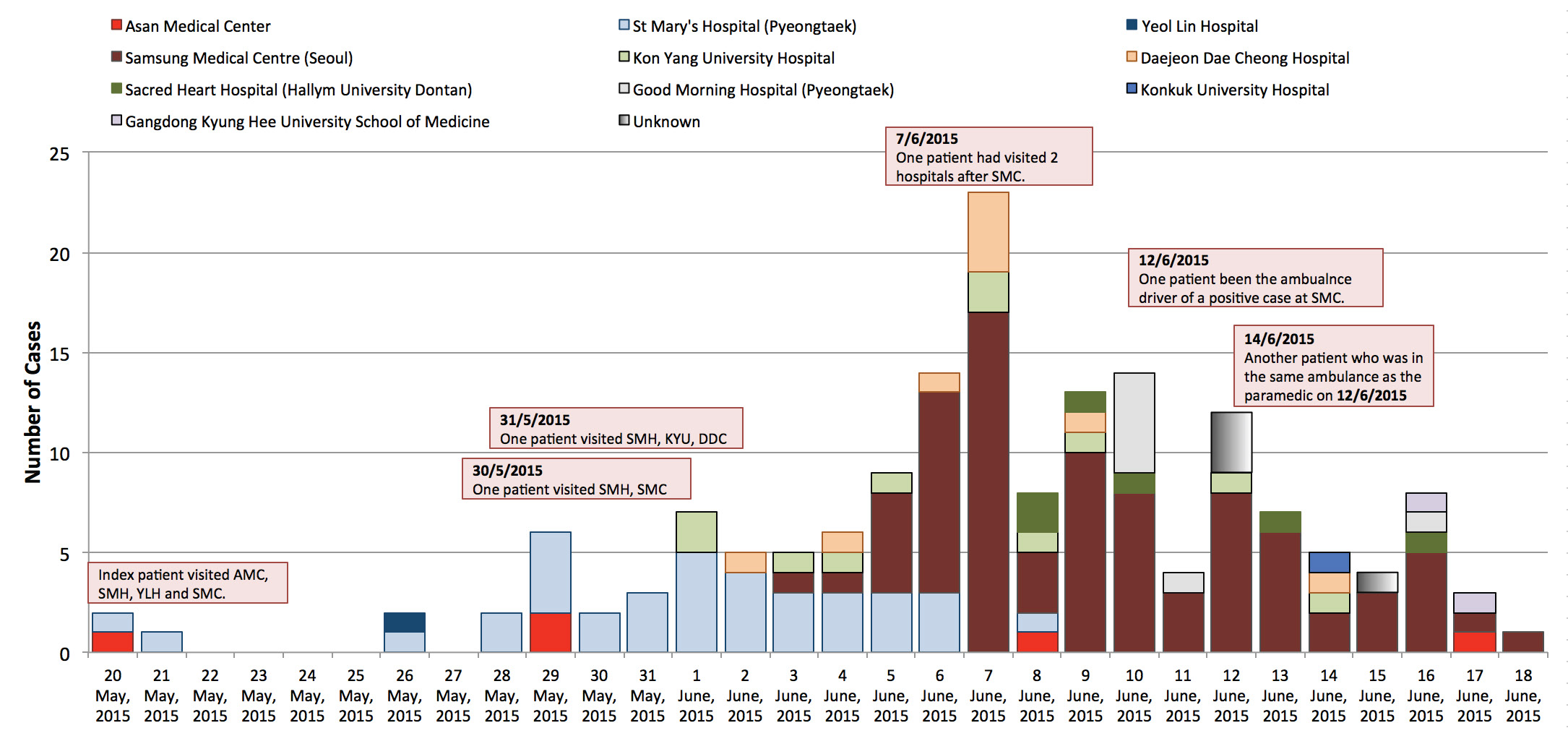 The outbreak in South Korea seems to be winding to a close, with just four cases reported over the past two days. There are now 24 deaths from 166 cases (14.5%), with the caveat that probably over half of the cases would not have recovered from their illness yet. I would nonetheless expect the final case fatality rate to be lower than that reported from the Middle East (approximately 41%), given the better medical treatment and – more importantly – intensive care support available in South Korean hospitals. It seems that the Koreans are also starting experimental plasma treatment (i.e. using plasma from recovered patients that contain antibodies to the MERS-CoV), which we had considered during the SARS outbreak in 2003, but shelved because the outbreak was already winding to an end even as this was being discussed.