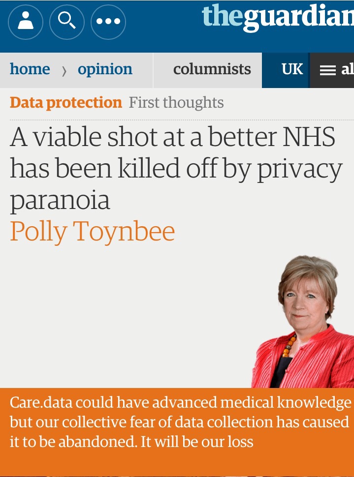I was forwarded an article written by Mary Louisa Toynbee and published in the Guardian a couple of days ago, decrying the failure of the U.K. NHS’ care.data program. This was an ambitious plan to curate anonymised patient electronic medical and social care records into a single database for the purposes of research and improving care. The concept was (and still remains) laudable but implementation was deeply flawed, largely due to lack of transparency (data was sold to private companies without prior announcement), poor management and lack of effective public communication.