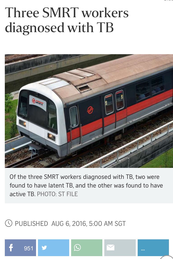 Curiously, a report of 2 SMRT train drivers and a crew manager being diagnosed with TB made it to the news today. Only one among them had active disease – the other two were diagnosed with latent tuberculosis which is non-infectious. Such cases are rarely highlighted in our mainstream media.