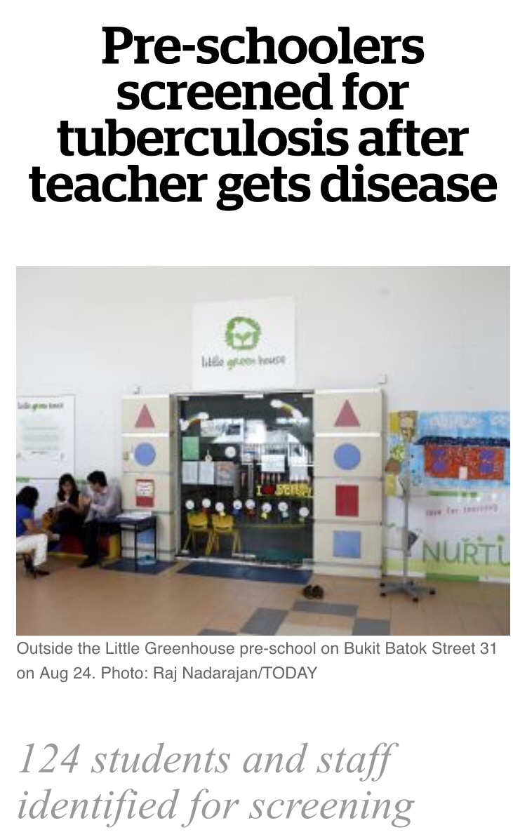 The latest to make the news is that of a pre-school teacher (Little Greenhouse, Bukit Batok) who was diagnosed with pulmonary TB last Wednesday, leading to planned screening of all 104 pre-schoolers 20 staff.