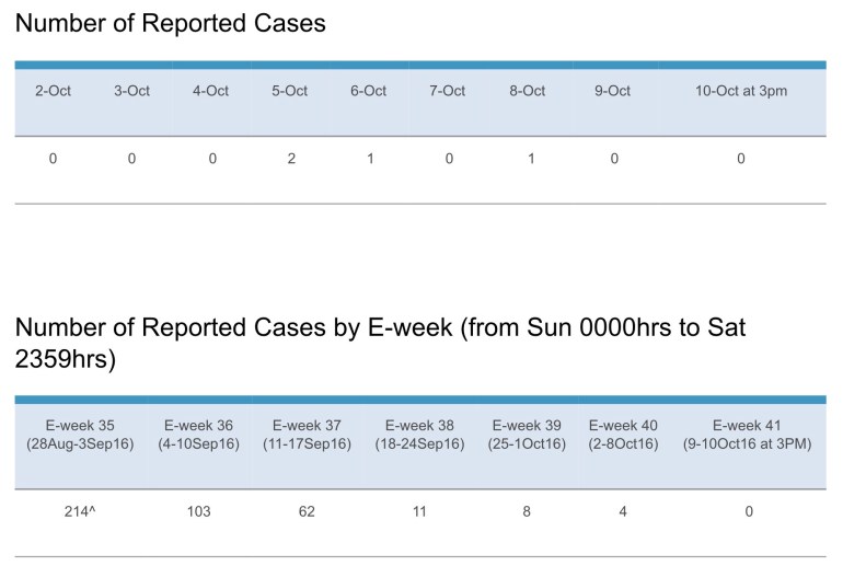 How much of this is due to actual control efforts, and what can be attributed to under-reporting (the Zika test is no longer subsidised by MOH except for those involving pregnant persons, and any suspect cases are no longer directed to the hospitals) is unknown. The number of dengue cases has also fallen, with 175, 174, and 138 cases during E-weeks 37 to 39 (up to 1st October 2016), which perhaps corresponds with the higher rainfall as well as extended vector control efforts for Zika.