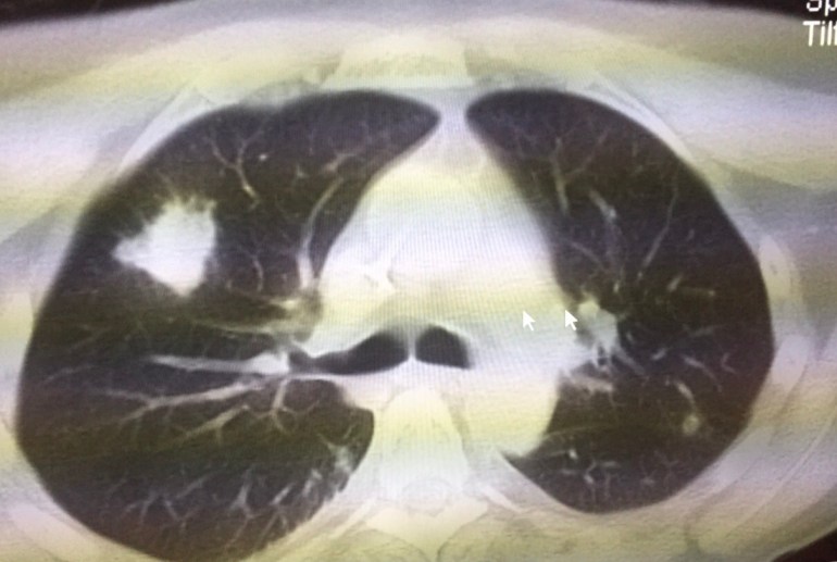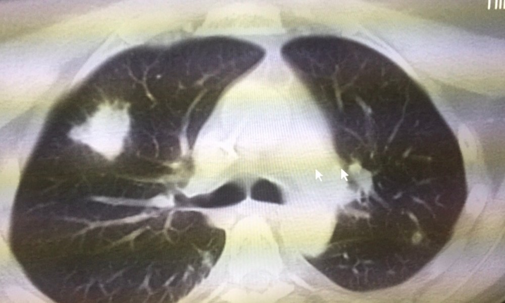 Just after engraftment, he developed fever again (absolute neutrophil count of 370 cells/cubic millimetre of blood). Septic work up was negative, and empirical piperacillin/tazobactam for 5 days did not help. A CT thorax was done, showing a solid nodule (figure). He had remained on oral posaconazole throughout the period.