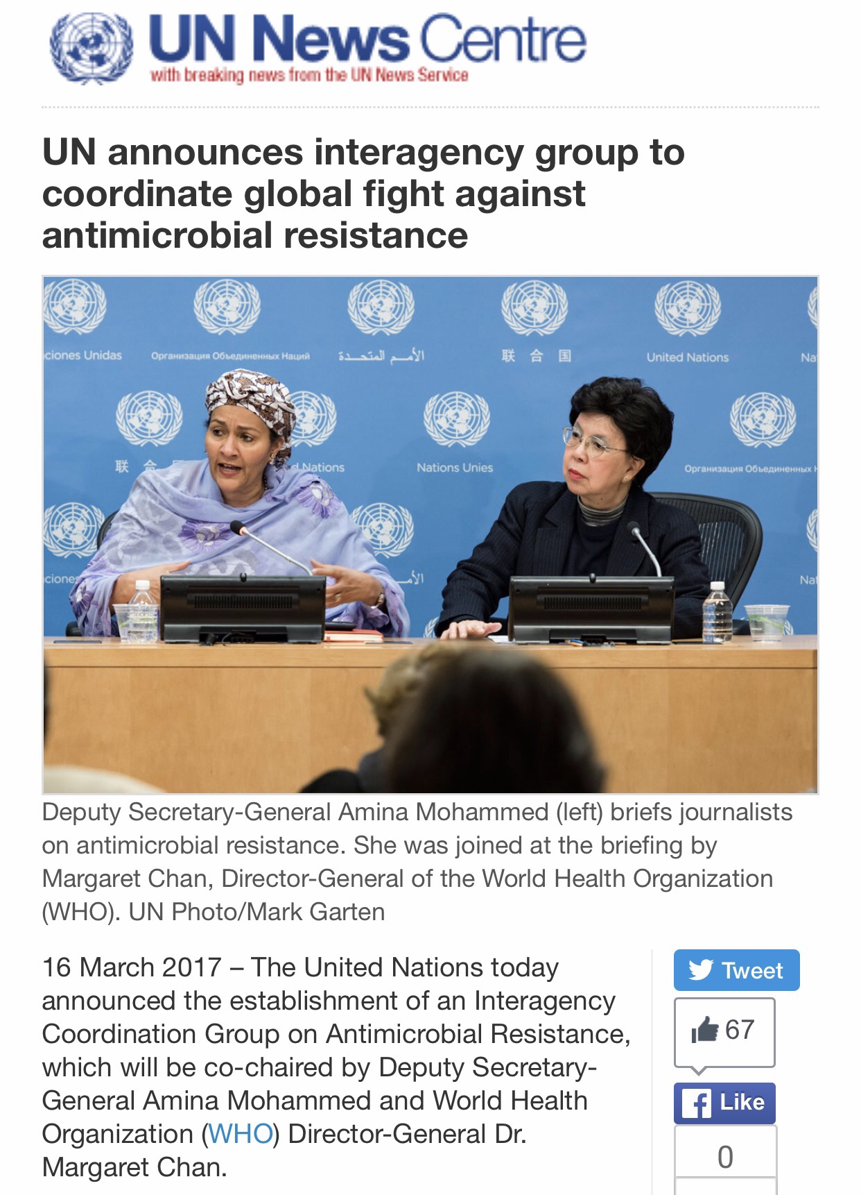 Announced by the United Nations this morning, the newly established group – which comprises high level representatives from various UN agencies, other relevant organisations, and experts from human and animal health as well as environmental sectors – will be co-chaired by UN Deputy Secretary-General Amina Mohammed and WHO Director-General Margaret Chan. The other members of the Group were not introduced at this point in time, but hopefully more details will be available soon.