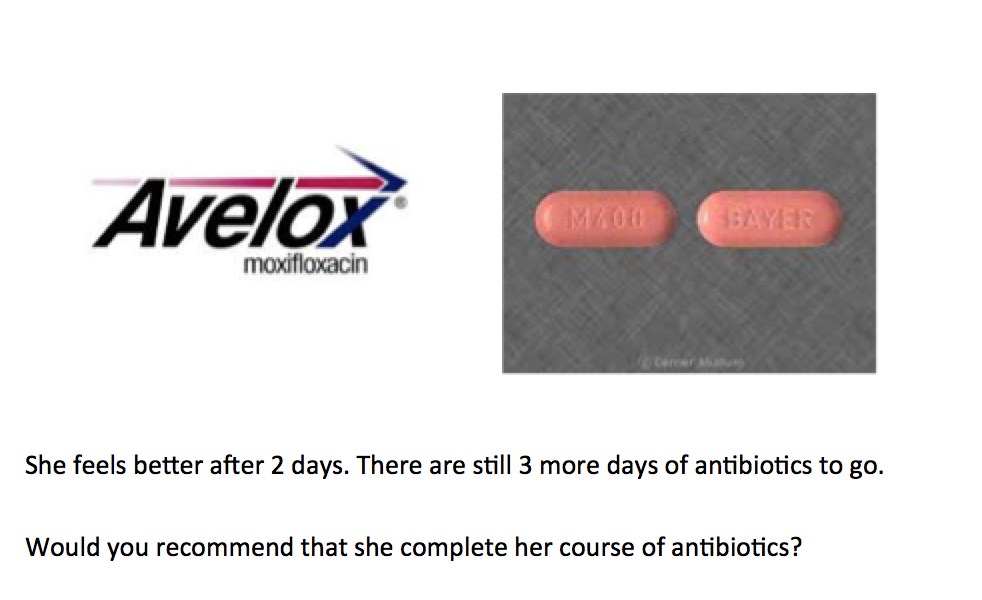 The final question: if this young woman was prescribed 5 days of moxifloxacin by a colleague, felt better after two days, then asked on a professional basis whether she could stop the antibiotics, what would they recommend?