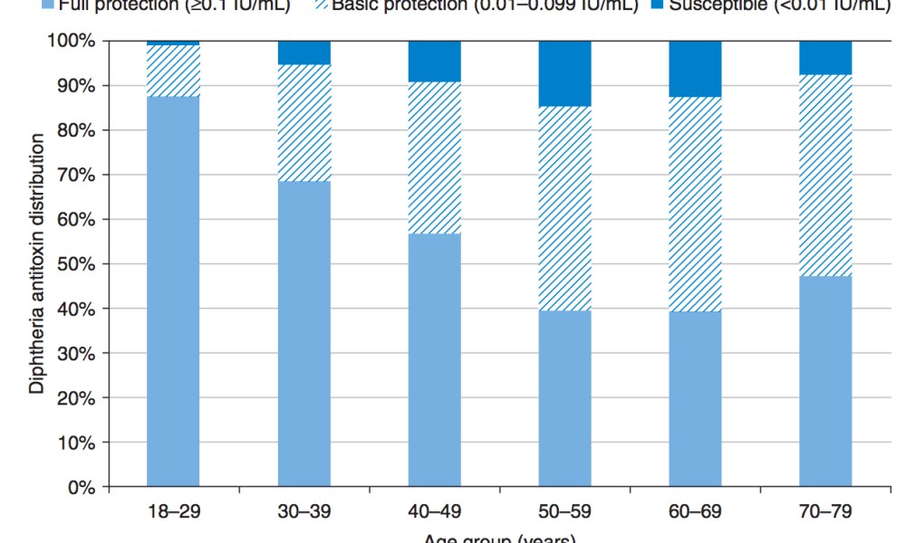 In that study, residual sera from 3,293 adults (age 18-79 years) that had participated in the National Health Survey were tested for IgG antibodies to diphtheria and tetanus, with the finding that 92.0% of those tested had at least basic protection against diphtheria. As with the case in other parts of the world, the authors noted that seroprevalence declined with age, with the most marked drop occurring for diphtheria in those in the age 50-59 years bracket.