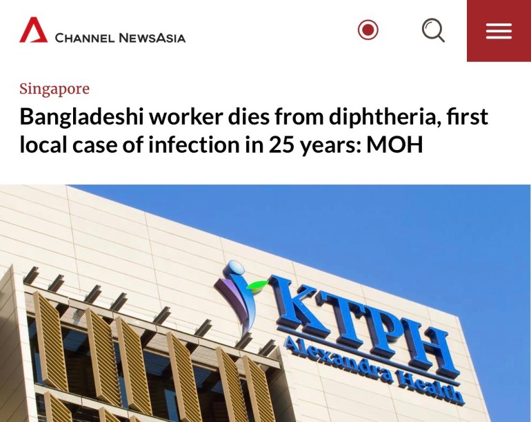 The last case of diphtheria (prior to this current unfortunate Bangladeshi construction worker) was reported in Singapore in 1992, but as can be seen from the screenshot of the WHO diphtheria page for Singapore below, the disease had already become very rare since before the 1980s.