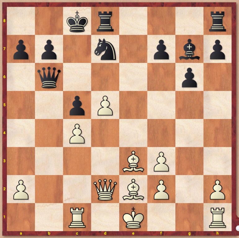 We both saw the resulting endgame (below) but assessed it differently, just like we both saw 20…. Rxe2! but assessed it erroneously. With the passage of time, it is hard to remember how the calculation and assessment error arose. After 20…Rxe2 21.Qxe2 Qxd5, I saw 22.c6 Qxc6 23.Rd1 Nc5 and thought White was better, but Stockfish’s estimation is that it is equal, and in fact White has to play carefully or else the passed d-pawn will win the game for Black. Also possible was to try to keep the c5 pawn: 22.Rd1 Ne5 23.Kg2 Nc6 but again Black is very comfortable. The move to try to change queens 22.Qe4?! is worse after 22….Ne5!
