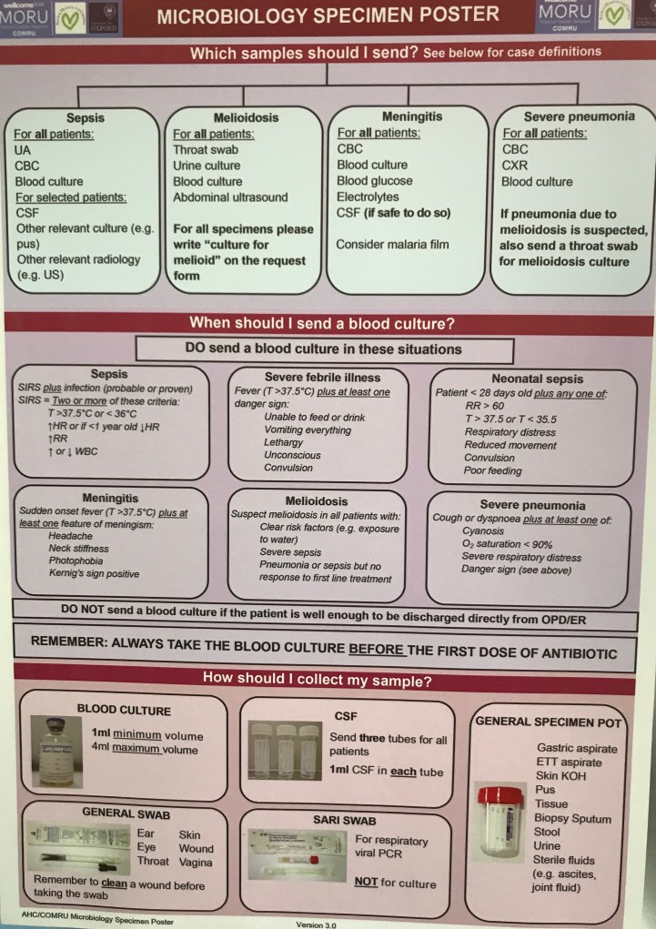 Because of the COMRU involvement, the hospital’s microbiology laboratory is the most impressive I have seen among the several developing country hospitals that I have visited. There is no automated blood culture system, but the lab uses culture media produced by Phnom Penh’s University of Health Sciences, and performs susceptibility testing according to US’ CLSI. They even use Etest strips judiciously, including for ciprofloxacin against Salmonella, penicillin and ceftriaxone against the pneumococcus, and cotrimoxazole against Burkholderia pseudomallei. Perhaps most impressive was the poster below, seen on the walls of many of the wards.