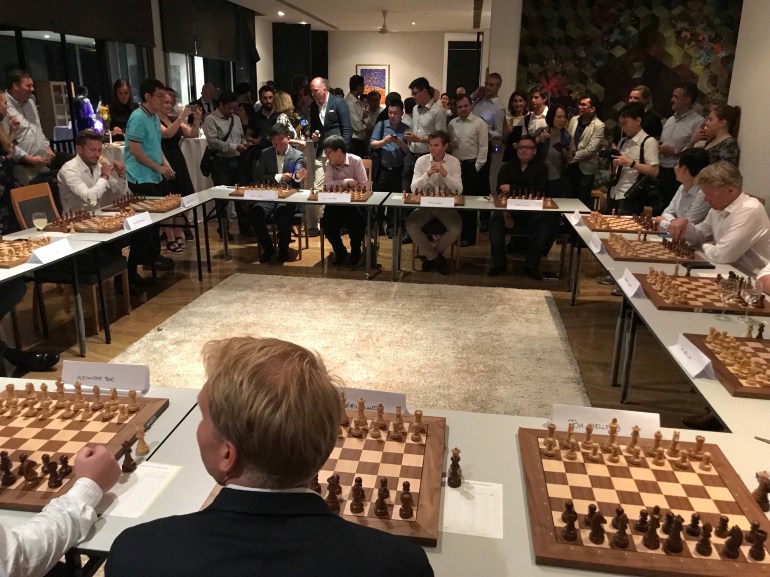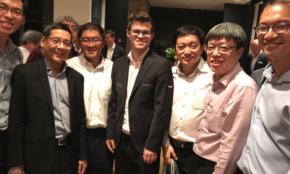 Yesterday evening, I was privileged to be able to witness current world chess champion Magnus Carlsen in action. In an event organized by the Norwegian Business Association and Simonsen Vogt Wiig law firm, Carlsen played a simul exhibition against 16 opponents at the Norwegian Ambassador’s Residence. The “opposition” were all chess amateurs, ranging from novices to the extremely strong IM and 6-time Singapore champion Kevin Goh Wei Ming. There were only 3 other players I recognized – chess historian Olimpiu Urcan, Joshua Lim Geok Hock who was a childhood chess adversary, and Dr Lee Chien Earn who is CEO of Changi General Hospital and father of one of our strongest chess juniors.