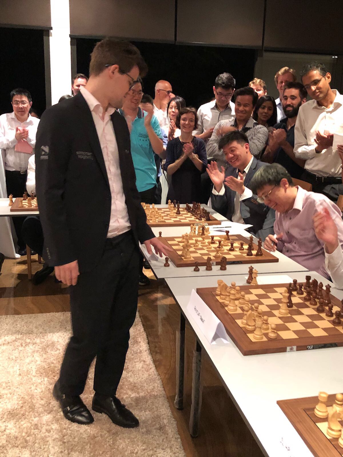 The world champion played quickly and confidently, moving from board to board at an almost rhythmic pace. He paused the longest over his game against IM Goh Wei Ming, as one might expect. In that game, arising from an English opening, he almost got into trouble against Wei Ming’s opening prep, but made a number of remarkable decisions that kept the tension in a deceptively calm position. Wei Ming was able to keep up for a while, but as more and more of the other players lost and Carlsen returned to his board at shorter and shorter time intervals, he finally blundered a pawn in a double rook and bishop vs. Carlsen’s double rook and knight endgame. After that, despite only thinking a few seconds each time, the world champion demonstrated ruthless technique. It has always been a learning experience to go through Carlsen’s endgames, but a special treat to witness it in person.