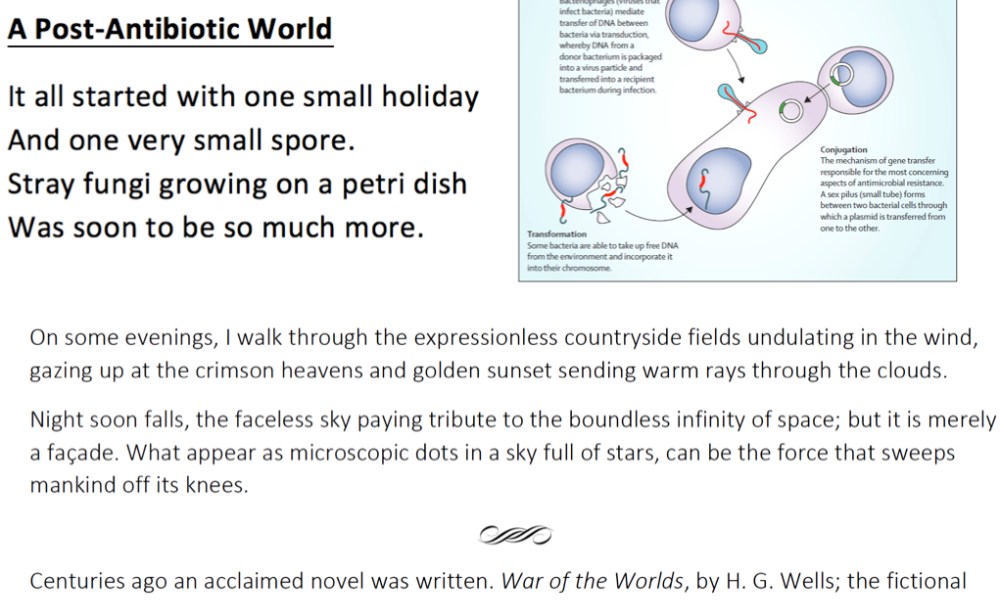- First Prize: Chan Ger Hui (Dunman High School) – “A Post-Antibiotic World”