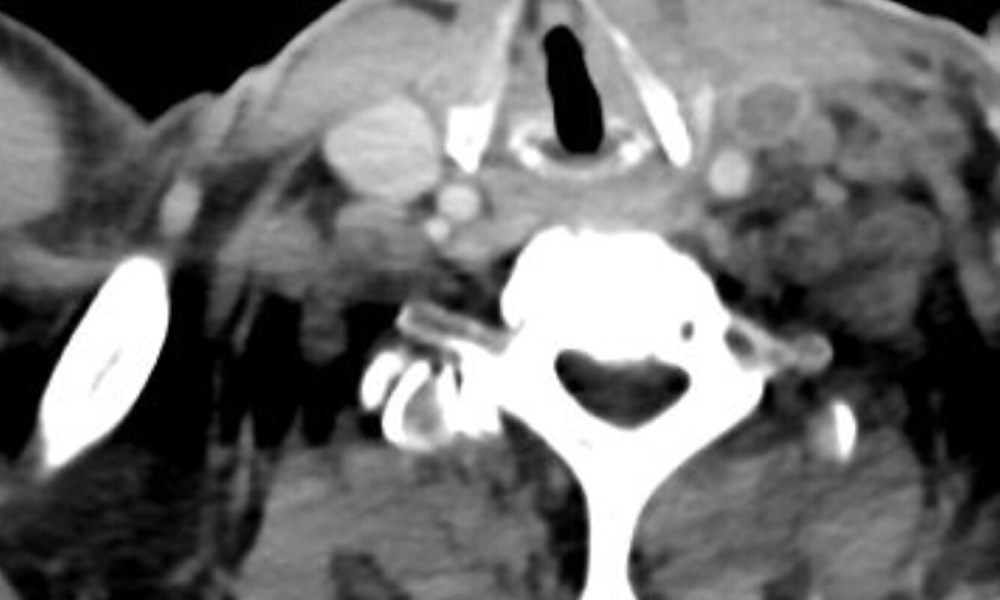 Investigations showed neutrophilic leukocytosis (WBC of 24K), cholestatic jaundice, as well as a high CRP of 217 mg/L CT of the abdomen was normal, but the following was seen at the neck and thoracic inlet.