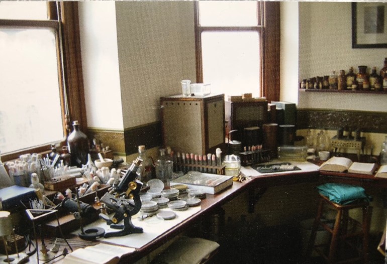 The rather cramped room – situated on the second floor of a hospital building, was indeed the actual room where Fleming worked between 1919 and 1933, but had been converted to a medical students’ call room for use during their midwifery posting (coincidentally one of the students to use this room was Fleming’s son Robert) before being turned into the museum. The picture below is taken from a postcard sold by the museum – no photography is allowed within its premises!