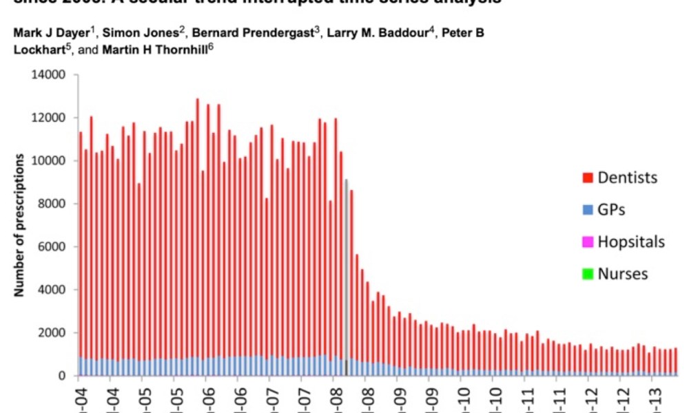 However, the longitudinal data from the UK was more damning, as can be seen from the images below. Endocarditis rates increased dramatically – particularly in “high-risk” patients – after the NICE guidelines were introduced. This corresponded with a sharp decrease in community prescription of antibiotics (article behind a paywall).