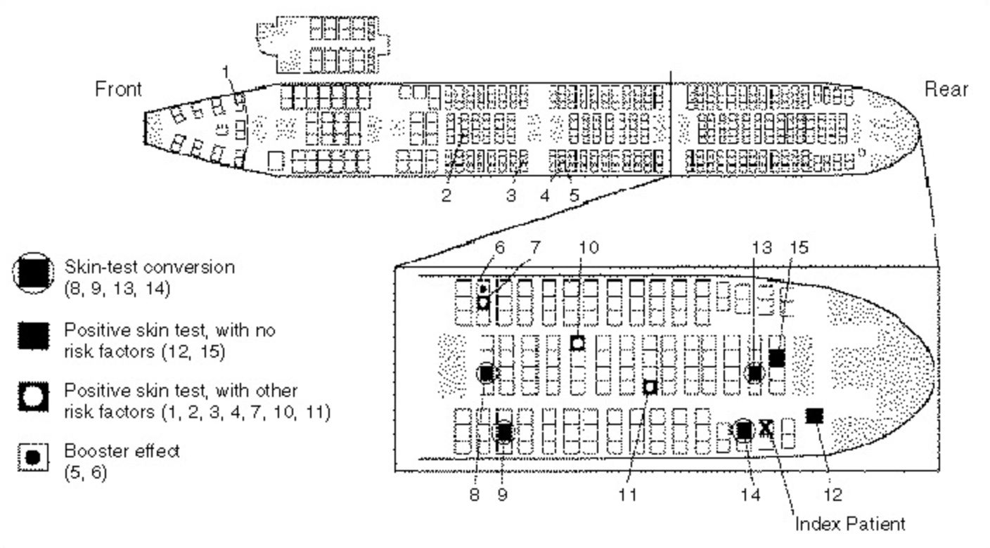 Researchers at the European Centre for Disease Control and Prevention (ECDC) published an updated systematic review on TB transmission on aircraft in 2016. There were only 21 reports included – the latest publications were in 2012 – involving smear-positive index cases with TB, of which only 1 provided substantial documented evidence of TB transmission (in 14 reports, no apparent transmission occurred). This study was published 1996, and only passengers in the same aircraft section were potentially infected (figure from the NEJM paper below).