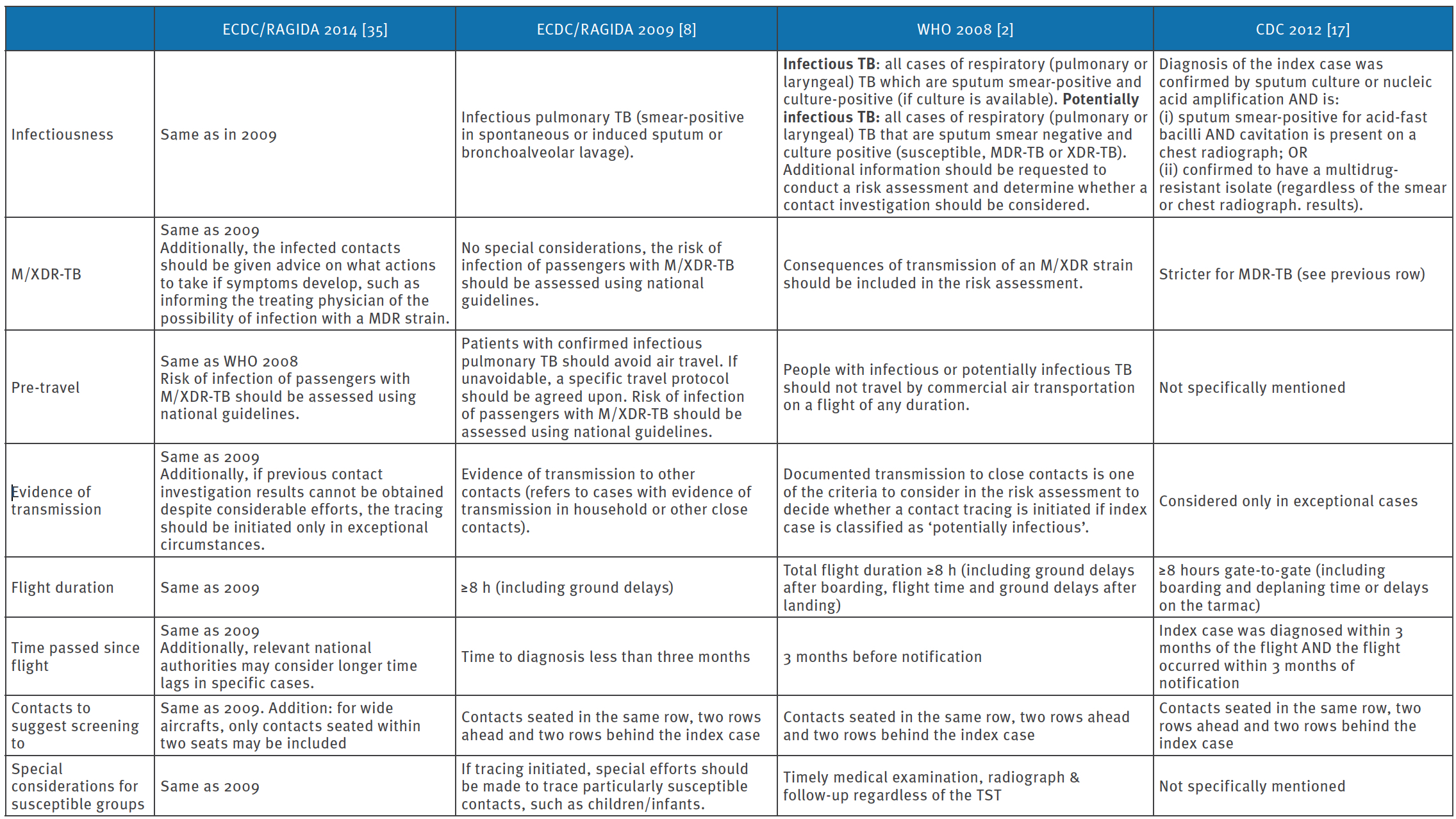 The conclusion was that the risk of TB transmission aboard an aircraft was very low – 0.1% to 1.3% of aircraft contacts on flights exceeding 8 hours, with the highest risk occurring in passengers seated within 2 rows of the index case. However, the quality of evidence was generally very low. One useful byproduct of the systematic review was the comparison between ECDC, World Health Organization, and CDC guidelines (below). Most other countries – including Singapore – tend to have guidelines that are identical or else very similar to one of these three.