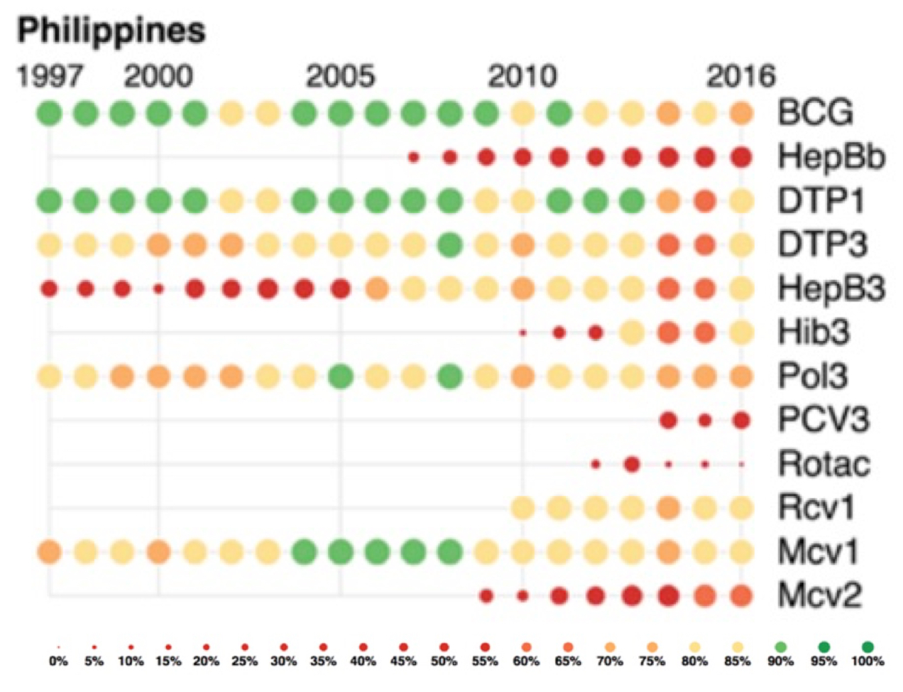 In the image below, obtained from the WHO vaccination scorecard , one can see that the vaccination coverage of the first measles vaccination dose (Mcv1) in Philippines hovered around 85% this decade. After 2017, this plunged to around 50%-60% .