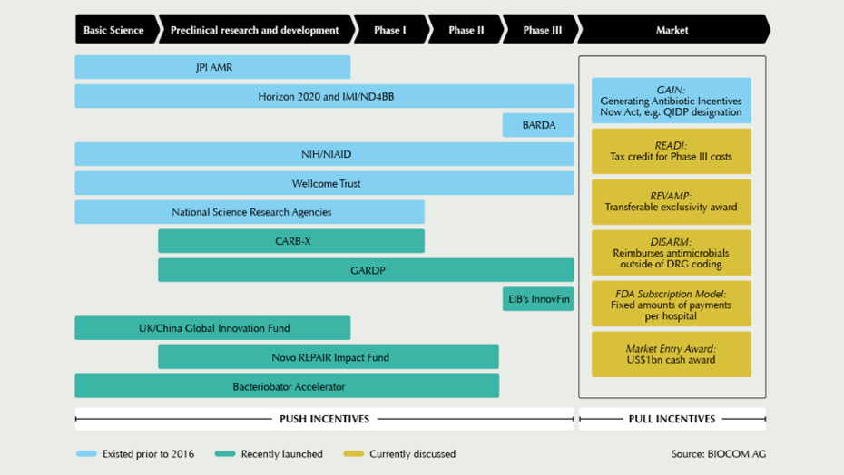There are now a significant number of public and public-private initiatives that aim to spur the development of new (and new classes of ) antibiotics, utilising both “push” (i.e. providing funds) and “pull” (i.e. assurance of a market) incentives. Many of these are nicely listed in the AMR Conference website (screenshot below). The UK initiative will fall into the latter group of incentives, assuring pharmaceutical companies that there will be confirmed revenue regardless of the future volume of sales of these drugs by paying for them upfront.