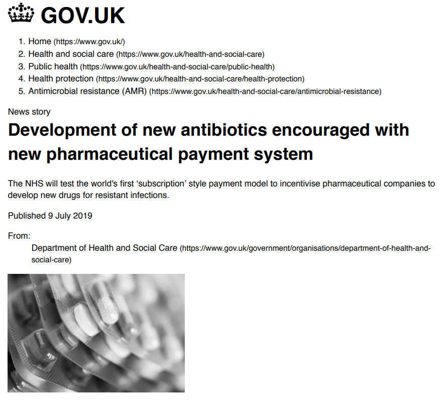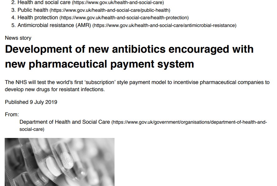 A belated post on the announcement on 9th July that UK will be testing a subscription model for antibiotics that hopes to encourage the pharmaceutical industry to develop new antibiotics in the future.