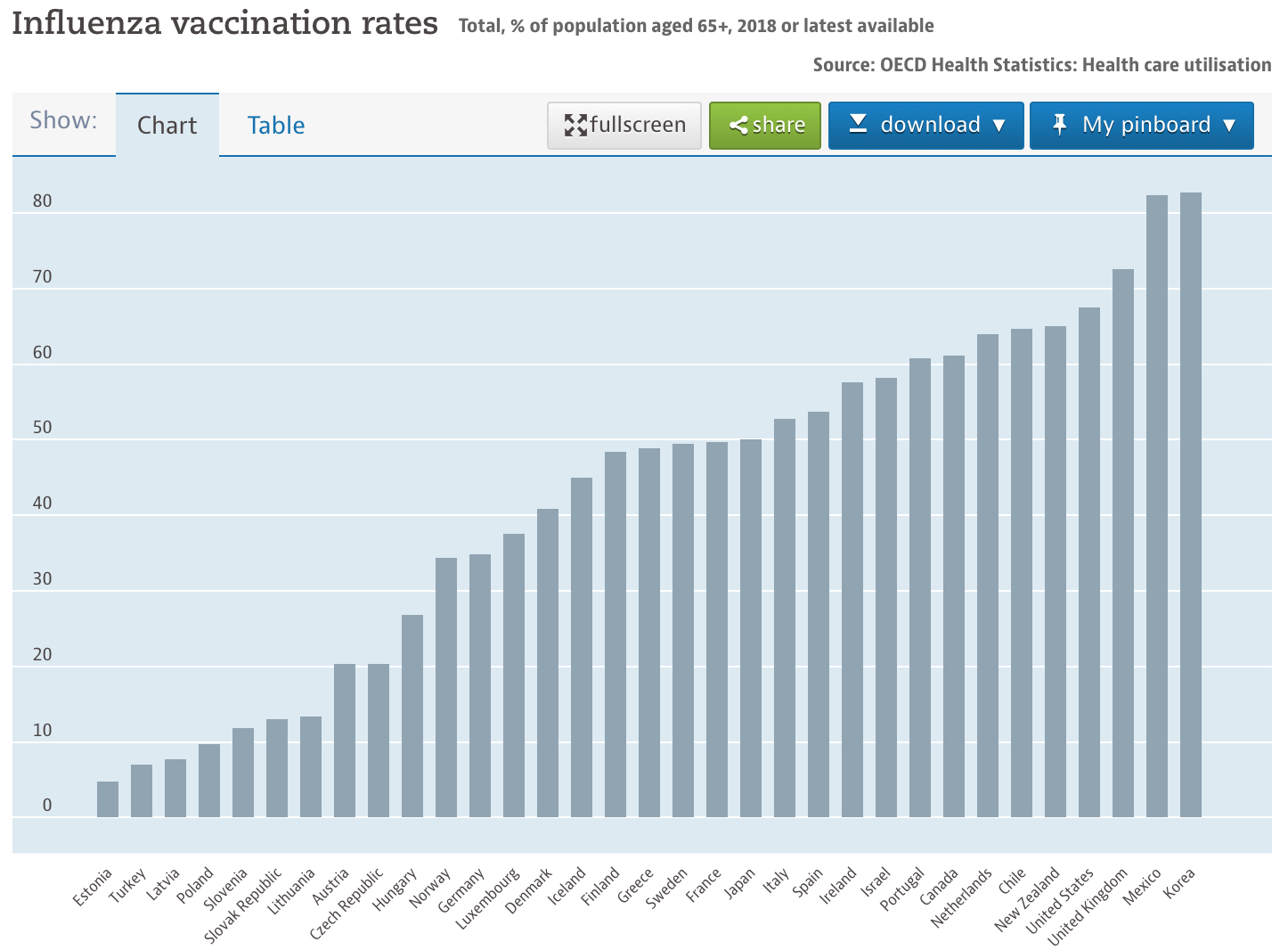 - Adult (age >65 years) influenza vaccination is an OECD (Organization for Economic Cooperation and Development) indicator, and many countries have really impressive vaccination rates (see chart below, which is a screenshot from the OECD website). Based on 2016 data, Singapore would rank in the bottom third of countries.
