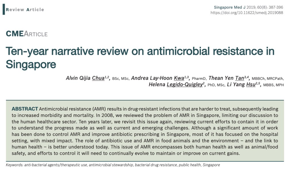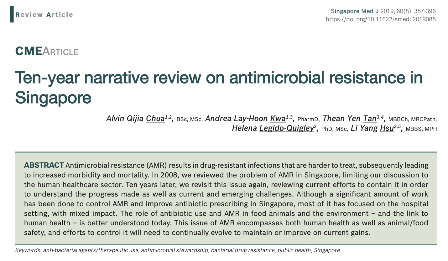 In 2018, some of us decided to write a follow-up paper describing what had come of those recommendations, and more generally on the situation of antimicrobial resistance and its control in Singapore. The Singapore Medical Journal was kind enough to publish the paper, although – for a variety of good reasons including that of the risk of author bias – narrative reviews are not in vogue academically today.