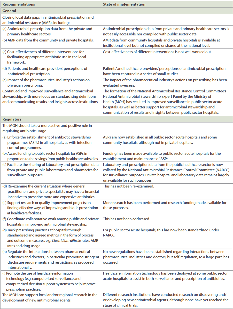 Still, it is quite clear that we are just embarking on efforts to contain antimicrobial resistance and reduce inappropriate antibiotic use in Singapore, and it will be interesting to review what will happen over the next 10 years. The list of recommendations in 2008 and what we felt were the outcomes over 10 years are shown below.