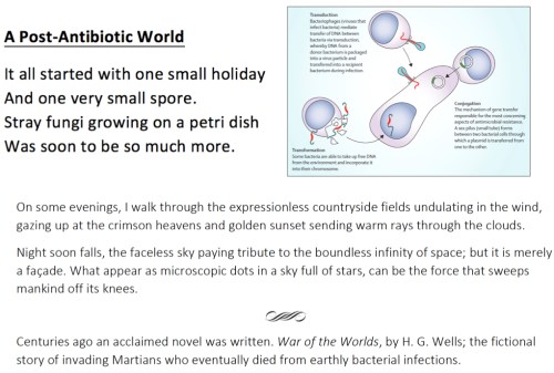 This excellent technical essay (except for the part where I was quoted!) by Mstr Quek Sze Yang from Ngee Ann Polytechnic was awarded one of the two Merit Awards by our judges. Post-Antibiotic World: The Antibiotic Apocalypse 1. Introduction A grim and dreadful future is looming – a future where one of the most widely […]